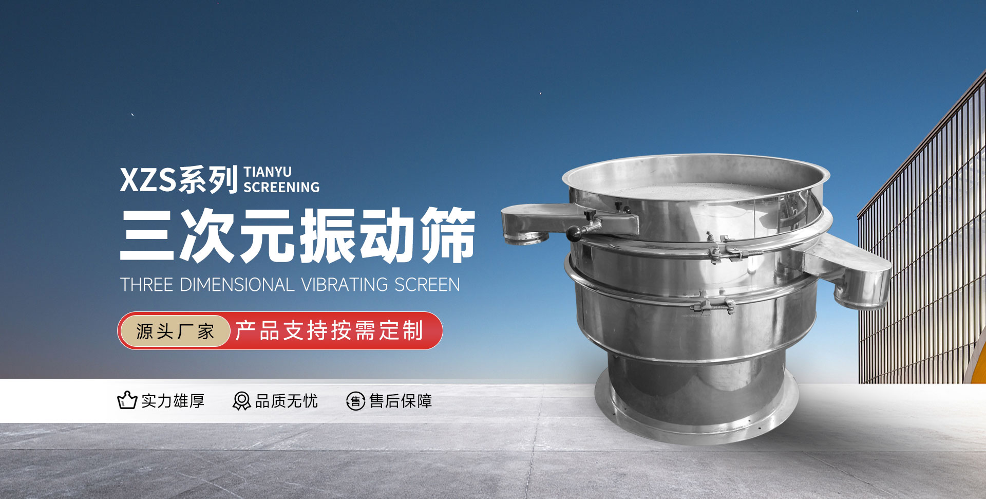 一條龍的特色。公司連續(xù)多年走產(chǎn)、學(xué)、研、相結(jié)合的道路,長(zhǎng)期與大專(zhuān)院校進(jìn)行技術(shù)交流與合作以此為后盾,自行開(kāi)發(fā)和研制的十余種新產(chǎn)品,經(jīng)有關(guān)鑒定,均達(dá)到了標(biāo)準(zhǔn)。 公司擁有各類(lèi)先進(jìn)的機(jī)加、設(shè)計(jì)、檢測(cè)設(shè)備,建有振動(dòng)仿真實(shí)驗(yàn)場(chǎng)和振動(dòng)設(shè)備檢測(cè)系統(tǒng)。對(duì)公司研究、設(shè)計(jì)、生產(chǎn)的各類(lèi)振動(dòng)設(shè)備進(jìn)行物理和機(jī)械性能測(cè)試。對(duì)各部位進(jìn)行應(yīng)力、應(yīng)變、剛強(qiáng)度等力學(xué)參數(shù)進(jìn)行測(cè)試;對(duì)振幅、振頻、振型及其軌跡進(jìn)行測(cè)試描述。公司力求用數(shù)據(jù)來(lái)指導(dǎo)設(shè)備的科研、開(kāi)發(fā)、生產(chǎn),使用戶(hù)無(wú)后顧之憂(yōu)。 您好!歡迎訪(fǎng)問(wèn)新鄉(xiāng)市天宇篩分機(jī)械制造有限公司。制造振動(dòng)篩、震動(dòng)篩、氣旋篩、振動(dòng)篩、氣流篩、系列直線(xiàn)篩、礦篩、超聲波旋振篩、直排振動(dòng)篩、斗式提升機(jī)、螺旋給料機(jī)、振動(dòng)給料機(jī)、皮帶輸送機(jī)等振動(dòng)篩分設(shè)備、輸送設(shè)備、實(shí)驗(yàn)設(shè)備、過(guò)濾設(shè)備、粉碎設(shè)備、振動(dòng)設(shè)備,產(chǎn)品廣泛應(yīng)用于:化工、食品、醫(yī)藥、冶金、陶瓷等行業(yè)。設(shè)備先進(jìn),技術(shù)力量雄厚,吸收國(guó)內(nèi)外眾多廠(chǎng)家的先進(jìn)技術(shù)的同時(shí)又開(kāi)發(fā)和研制出結(jié)構(gòu)新穎,制作精細(xì),如果你對(duì)我公司產(chǎn)品有什么意見(jiàn)請(qǐng)來(lái)電咨詢(xún),Tel:0373-7327555